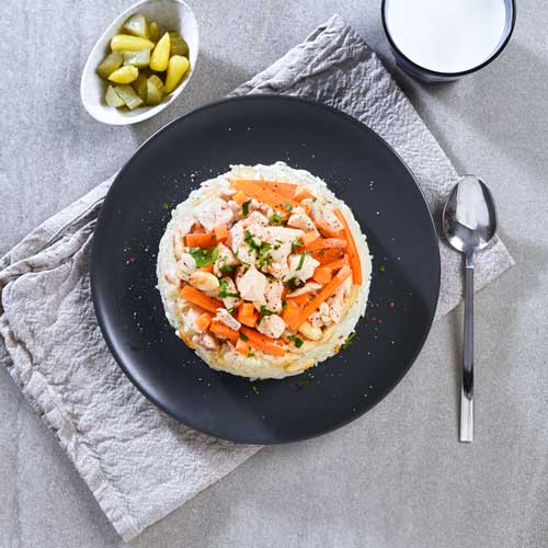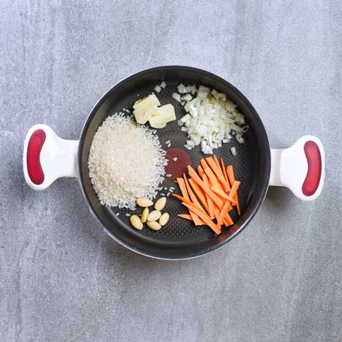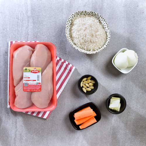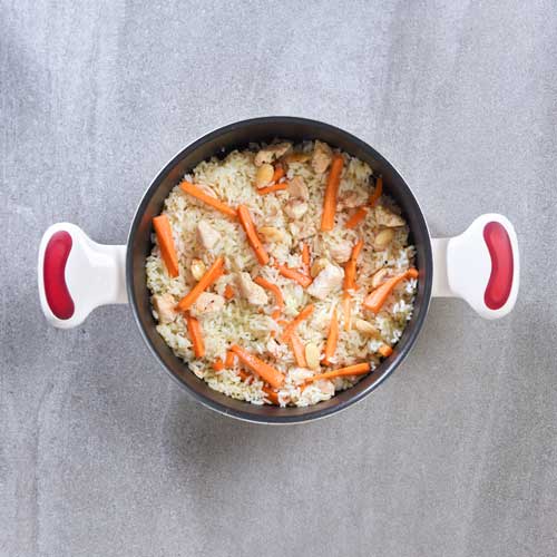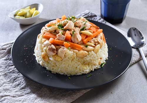 Soğanlarınızı ve tavuklarınızı küp küp doğrayın. Havuçlarınızı da julyen doğrayın Bir tencerede soğan, pirinç, havuç ve bademlerinizi tereyağı yardımıyla kavurun. Tuz ve karabiber ilave edip suyunuzu ekleyin ve tencerenizin kapağını kapatıp pilavınızı pişirin. Pişen pilavınızı dıcak olarak servis edin.