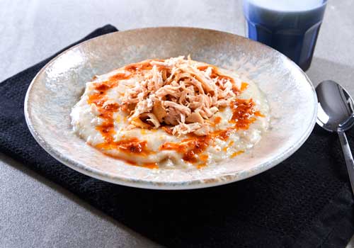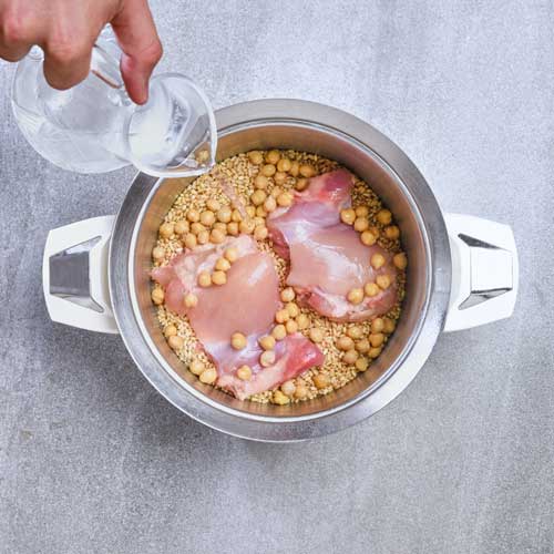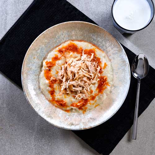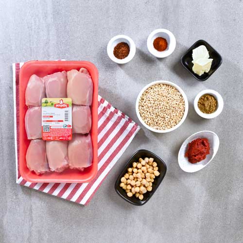 Buğdaylarınızı bol suda iyice yıkayın. Bir tencerenin içerisine aşurelik buğday, yoğurt ve tavuklarınızı ekleyip buğdayların üzerini geçecek kadar su ekleyin ve kısık ateşte ara ara karıştırarak pişirin. Tencerenizdeki su azaldıkça buğdaylarınız pişene kadar ara ara sıcak su ekleyerek pişirmeye devam edin. Pişirme esnasında tahta bir kaşık yardımıyla buğdaylarınızı ezerek karıştırın. Bu sırada sosu için bir tavada tereyağınızı eritin. Salçanızı tereyağı ile kavurun. Pul biberi kırmızı toz biber ve kimyon ekleyip tavanızı ocaktan alın. Pişen keşkeğinizi servis tabağınıza alın. Üzerine hazırladığınız sosunuzdan dökerek servis edin.