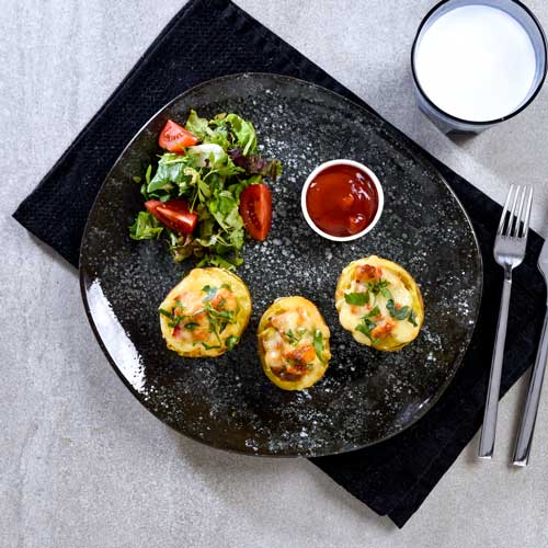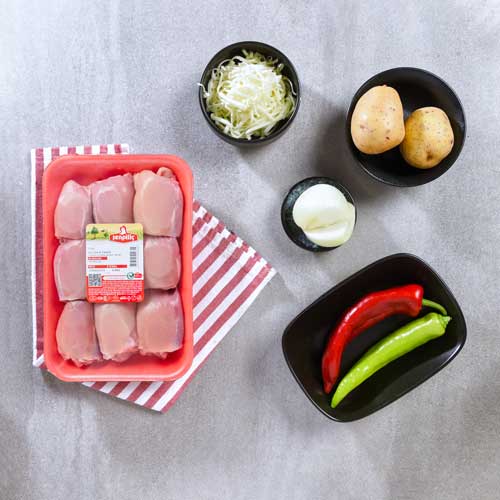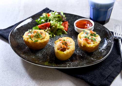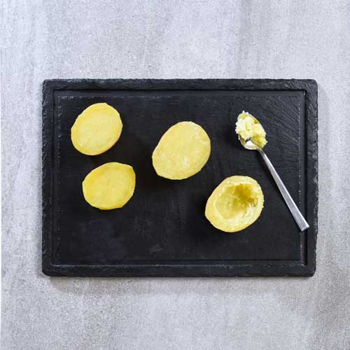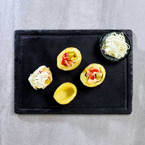 Patateslerinizi bol suda haşlayın. Bu sırada tavuklarınızı, soğanınızı, kırmızı biberinizi ve yeşil biberinizi küpler halinde doğrayın. Doğradığınız tüm malzemeleri bir tavada zeytinyağı ile soteleyin. Pul biber ve tuz ekleyip bir kenara alın. Haşlanan patateslerinizi ikiye bölüp iç kısımlarını oyun. Sotelediğiniz tavuklarınızı patateslerinizin içerisine doldurun. Üzerine rendelenmiş kaşar peyniri ekleyip fırın kabınıza yerleştirin. Önceden ısıtılmış 190 derece fırında peyniriniz eriyip kızarana kadar pişirin ve sıcak olarak servis edin.